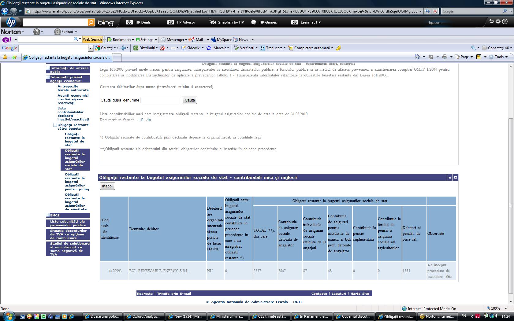 Potrivit site-ului ANAF, societatea EOL Renewable Energy, figurează în postura de a face obiectul procedurii de executare silită, cu datorii de 25.278 de lei la bugetul de stat, cu datorii de 836 de lei la bugetul asigurărilor de sănătate (unde vă bag coplata, sâc!), şi cu datorii de 5537 de lei la bugetul de pensii.
