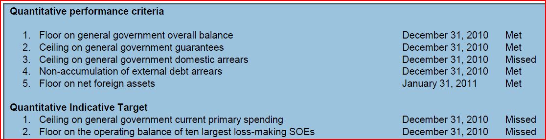 Cheia ratării primelor 3 indicatori o găsim în cele 3 criterii unde scrie ”Missed”, iar ratarea țintei de inflație o găsim în statisticile BNR. România declară că a îndeplinit criteriul deficitului bugetar (primul din listă), dar în fapt, asta este doar o minciună. Ratarea țintei de arierate (punctul 3) arată că atunci când guvernul nu a mai avut bani, nu a mai făcut plăți. Adică, am îndeplinit ținta de deficit bugetar doar din pix. Ratarea criteriului cantitativ a cheltuielilor bugetare ne arată că inclusiv cu tăieriele primitive de salarii și pensii sau cu majorarea la fel de primitivă a TVA, guvernul a cheltuit mai mult decât se angajase (aveți idee unde doamna Udrea?), iar ratarea plafonului de pierderi pentru cele mai mari 10 companii deținute de stat și generatoare de pierderi (pierderile au fost mai accentuate), dau în fapt măsura valorii acestui guvern și a clicii lor: incompetența.