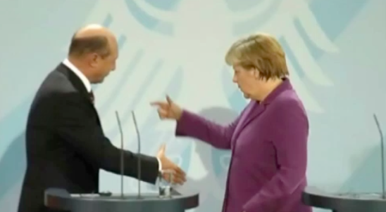 5. Traian Băsescu a mai dat-o în bară o dată. A întins mâna primul doamnei cancelar Merkel. Dânsa i-a fentat gestul și l-a direcționat pe domnul Președinte spre steaguri. Asta așa, ca amănunt picant. În timp ce președintele îi oferea ceva companii feroviare și unele energetice. Evident, la preț de solduri.