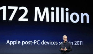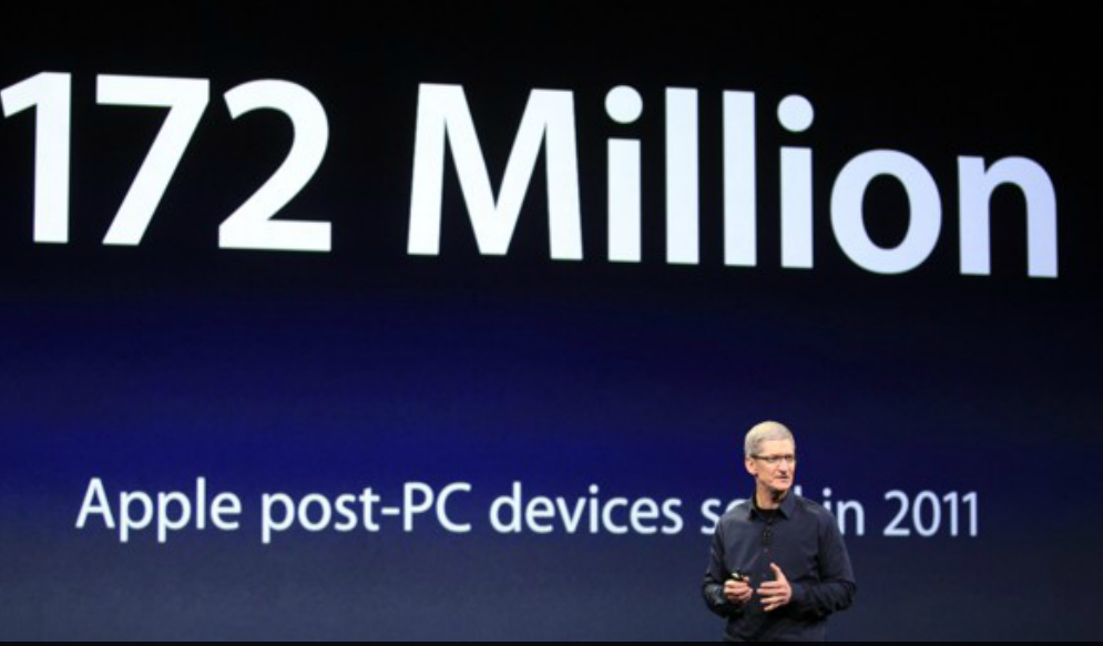 In discursul de lansare al celei mai recente generatii de iPad, Tim Cook, presedintele companiei a vorbit despre era post-PC. In aceasta ”era post-PC”, Apple a vandut anul trecut 172 de milioane de device-uri, unitati. In era post-PC, Tim Cook include iPod-urile, iPad-urile si IPhone-urile. Vanzarile de astfel de unitati au reprezentat 76% din vanzarile Apple, a spus Tim Cook