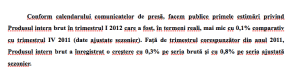 Fata de trimestrul I al anului 2011, PIB-ul s-a majorat cu 0,8% in serie ajustata sezonier si cu 0,3% in serie bruta. Datele detaliate vor fi oferite de INS peste circa 3 saptamani, in data de 6 iunie.