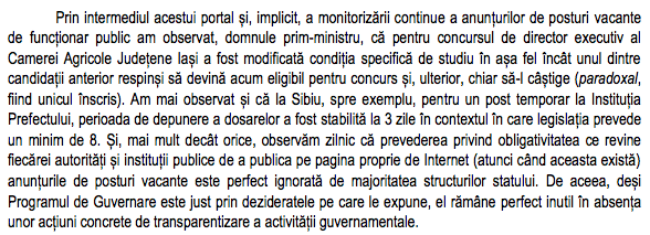 b) ”Pentru inceput vom prelua site-ul sa ca pagina oficiala de anunturi privind posturile publice”. Avand in vedere ca ”a prelua” este sinonim cu ”a lua in primire”, eu cred ca este un demers care inhiba antreprenoriatul, fara sa il stimuleze. Antreprenoriatul nu are ca scop sa ajungi sub pavaza autoritatii publice, cel putin din punctul meu de vedere. Apoi, sigur ca exagerez cand spun ca a prelua site-ul conduce inclusiv la posibilitatea ascunderii unor abuzuri de genul celor de la Iasi sau de la Sibiu. Si totusi, domnul Ponta nu intelege nici macar din scrisoarea lui Cristian, ca este obligatoriu ca toate autoritatile publice sa afiseze pe propriile site-uri ofertele de angajare? Ceea ce nu se intampla?