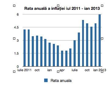 Faptul că am avut cea mai ridicată rată lunară a inflației din ultimele 30 de luni nu este singura veste proastă. ”Capitalizând” inflația din luna ianuarie 2013, inflația anuală (majorarea prețurilor în intervalul februarie 2012-ianuarie 2013) a urcat la nivelul de 5,97%. Astfel, inflația anuală a ajuns la cel mai ridicat nivel din ultimele 19 luni, sau avem cea mai ridicată rată anuală a inflației din iulie 2011 până în prezent. Cu alte cuvinte, asistăm la cea mai consistentă confiscare din venitul disponibil din ultimul an și jumătate. Detalii aveți în graficul de mai jos: