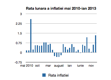 Datele comunicate ieri de Institutul Național de Statistică au fost, în lipsa unui cuvânt mai potrivit, dezastruase. Și asta pentru că Institutul Național de Statistică a confirmat faptul că luna ianuarie 2013 a fost cea mai inflaționistă lună din ultimele 30. Sau cea mai inflaționistă lună de la majorarea TVA-ului în iulie 2010 (de la 19% la 24%) până acum. Atunci, în iulie 2010, o majorare de 5 puncte procentuale a TVA-ului a condus la o majorare a prețurilor de consum cu 2,58%. Acum, fără un astfel de șoc draconic, inflația într-o singură lună a însemnat mai mult de jumătate.
