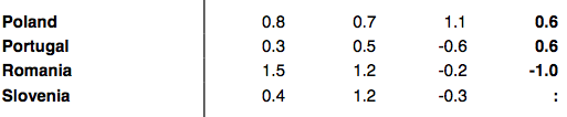 Așa că mă rezum la definiția lui Okun. Avem acest trimestru de creștere negativă față de precedentul: -1%. Cum a fost trimestrul anterior (T1 2014 față de T4 2013)? Aici inițiez dezbaterea legată de faptul că economia României se află deja în recesiune tehnică.
