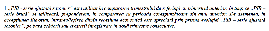 ,,Produsul Intern Brut în trimestrul II 2104 a fost în termeni reali mai mic cu 1% față de Trimestrul I 2014”. Față de același trimestru din anul 2013, PIB-ul din trimestrul II este mai mare cu 1,4%. În primele 6 luni ale anului, PIB a crescut cu 2,6% (serie ajustată sezonier), comparativ cu Semestrul I 2013.