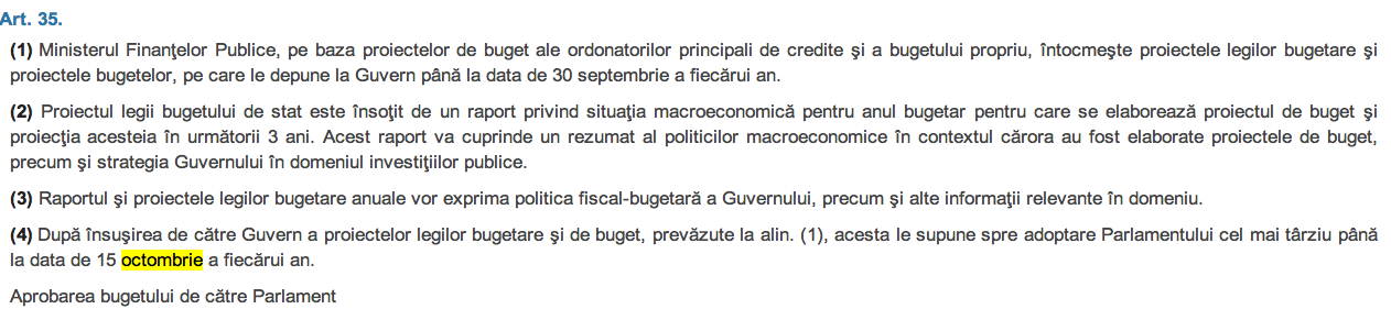 Tot ceea ce pretind este ca scenariile să fie discutate din timp (așa cum prevede Legea – Codul Fiscal), proiectul de buget să fie făcut din timp (până la 15 octombrie), așa cum prevede legea. Vreau ca aceia care sunt executivi, să respecte legea. Iar când, în opinia mea, nu o fac, îi întreb de ce. Iată și extrasul din Legea Finanțelor Publice: