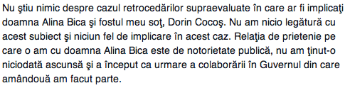 ,,Omul de afaceri Dorin Cocos ar fi cerut 10 milioane de euro pentru a interveni pe langa factori de decizie din Autoritatea Nationala pentru Restituirea Proprietatilor (ANRP) in legatura cu despagubirea lui Stelian Gheorghe pentru un teren in Capitala, reiese din referatul DNA la dosarul in care este cercetata si procurorul-sef al DIICOT, Alina Bica, potrivit Mediafax.”