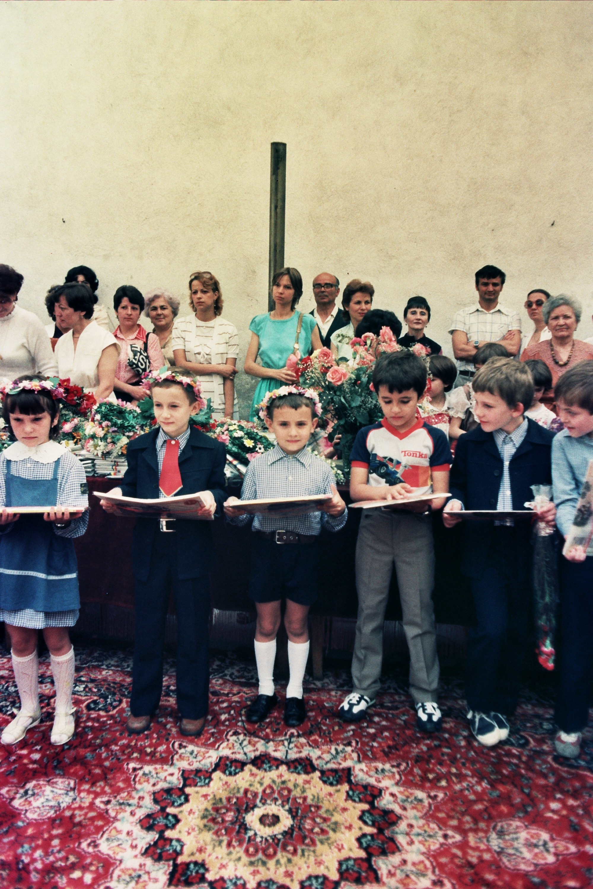 Am regasit astazi o fotografie făcută de tatal meu în urma cu 31 de ani. Eu, în mijloc, ca absolvent al clasei I-a E, la Scoala Generala nr. 19 din București. În dreapta mea – Bogdan și Nicoleta, iar în stânga Cătălin, Mihai și Cosmin. Atasez fotografia: