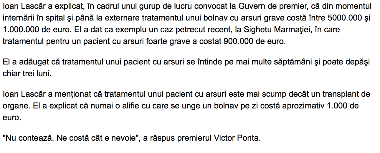 Scuzati-mi scepticismul, dar nu trebuie exclusa din start situația ca sub pretextul asigurării tuturor tratamentelor și medicației necesare, prețul acestora să fie supra-evaluat (motivat, nu-i așa, de urgență). Mizez pe buna credință a medicilor, dar nu contez pe cei care vor face achizițiile în regim de urgență. Realitatea a dovedit că pentru infractori, situațiile de urgență sunt oportunități de afaceri. Prin urmare, soluția este un singura: să se cumpere toate medicațiile necesare tratamentelor, și asta imediat, dar DNA să vegheze la modul în care se fac aceste achiziții (este o chestiune de ore pentru a realiza un centralizator cu prețurile la care se intenționează achiziția și cele din alte state ale Uniunii Europene). Compasiunea altor state europene este mai sinceră decât composiunea mimată de autoritățile din România. Urgența oricărui preț este justificată pentru câteva zile (în cazul în care statul român, incompetent și corupt endemic, nu are un stoc minim de medicație, preventiv), dar în nici un caz pentru orice prețuri pentru medicație/tratamente care durează câteva luni. ,,Nu contează. Ne costă cât e nevoie” – zice Ponta. Citiți contextul în extrasul de mai jos din Ziarul Gândul, în articolul în care Ioan Lăscăr spune că prețul tratamentului pentru câteva luni/pe pacient costă între 500.000 și un milion de Euro. Pe pacient!