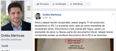 ,,Pentru adepții teoriei conspirației, atașez pagina 17 din protocolul declasificat cu PG. La scanarea color, apar pe verso stampilele de multiplicare xerox. Documentul a fost scanat alb-negru pentru ca stampilele de xerox nu făceau parte din documentul oficial. Adepții teoriei conspirației puteau să studieze documentul de la PG și se lămureau”, spune Marincea.