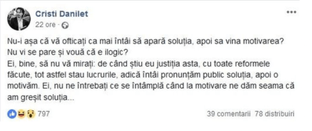 Un judecător de la Cluj – Cristi Dănileț. Dacă l-am întreba ce se întâmplă în situațiile când la motivare îș dă seama că a greșit soluția, greu am găsi un alt răspuns decât că nu dă doi bani pe lege, din moment ce a pronunțat o soluție greșită