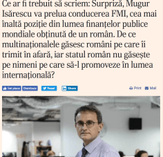 Inteleg că Ziarul Financiar (care nu este la primul tease mincinos prin intermediul Mediafax), anunță prin intermediul Mediafax : ,,Surpriză! Mugur Isărescu va prelua conducerea FMI, cea mai înaltă funcție din lumea finanțelor publice mondiale obținută de un român”.