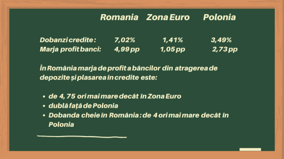 În Polonia, pentru același credit de 50.000 de Euro, împrumutatul polonez persoană fizică achită anual ca dobândă 1745 de Euro fațăd e 3.500 de Euro românul. O marjă mai mică de profit pentru acționarii băncilor înseamnă mai mulți bani pentru populație, cu atât mai mult cu cât aceasta este lovită de criză și de incertitudinea locurilor de muncă.
