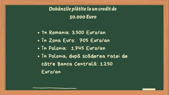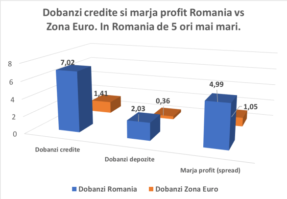 Să luăm un credit de 50.000 de Euro, unde, la o dobândă anuală de 7%, populația plătește dobândă de 3500 de Euro pe an. La același credit ipotecar, în Zona Euro, dobânda plătită de populație anual este de 705 Euro (dobânda este de 1,41% pe an pentru populație. Companiile se împrumută la dobânzi de 1,53% în Zona Euro. Cu alte cuvinte, într-un singur an românii plătesc dobânzile pe care le achită în 5 ani cei din zona Euro.