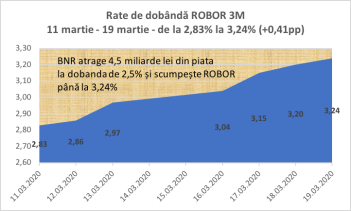 - Drept consecință a aspirării de lichiditate în acea săptămână, în 19 martie 2020, după 4 ședințe consecutive de creștere pe fondul împuținării lichidității de către BNR, rata de dobândă ROBOR (la care băncile se împrumută între ele) a ajuns la 3,24% (de la 2,83%). Pot presupune că o astfel de acțiune a BNR de a scumpi dobânzile din piață (înainte de o reducere cu 0,5 puncte procentuale) se încadrează perfect în situația în care obligațiile Consiliului de administrație condus de Mugur Isărescu față de acționarii băncilor comerciale primează în fața intereselor economiei naționale (populație, companii, stat). Dacă ar fi fost altfel, BNR ar fi scăzut dobânda și nu ar fi majorat-o, astfel încât populația, companiile și statul român să se împrumute mai scump în plină criză.