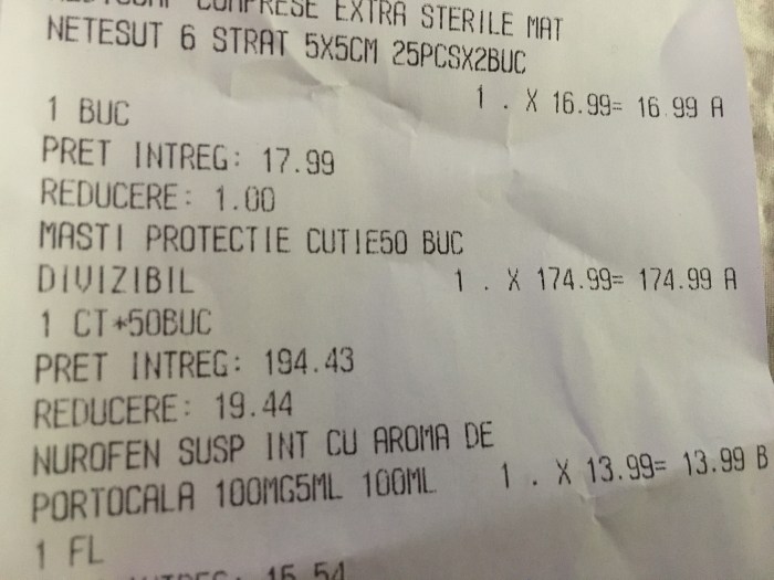 Astăzi am plătit, la faramacie, 174,99 lei, adică 3,5 lei pentru o mască (ce costa 20 de bani înainte de pandemie. De 17 ori mai mult. Prețul întreg era de 194,43 (3,88 lei/mască, diferența făcând-o cardul de reducere). De aceea vă spun, ca să știți de la mine: eventuala prelungire a stării de alertă NU este despre sănătate publică și nici despre economie.