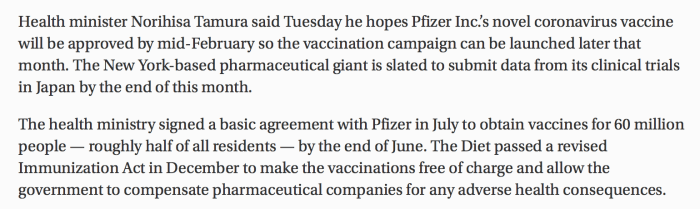 Deci nu este o problema ca Japonia nu are acces la vaccin cum lasa sa se inteleaga Vlad Voiculescu ( ,,nu a vazut”) – Japonia a semnat cu Pfizer inca din luna iulie pentru a obtine 60 de milioane de doze), ci este o chestiune de autorizare si abordare: Japonia isi ia toate precautiile si astepta rezultatele testelor clinice din Japonia pentru a autoriza (sau nu) vaccinul. Iar Pfizer trebuie sa prezinte autoritatilor de sanatate publica japoneze pana la sfarsitul lunii ianuarie, rezultatele testelor clinice din Japonia (pe care Japonia le vede, ca se fac acolo), urmand ca daca acestea sunt considerate satisfacatoare, sa aprobe cel mai devreme la jumatatea lunii februarie.