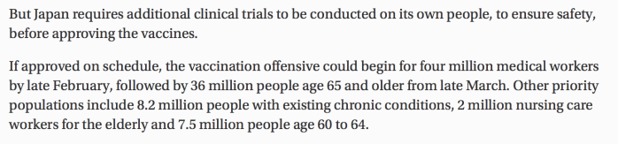 Cum sta de fapt situatia: Japonia a vazut doze de vaccin, doar ca Japonia nu a aprobat inca folosirea vaccinului Pfizer, pentru ca legislatia impune teste suplimentare pana la aprobarea vaccinului. Iar Japonia estimeaza o eventuala aprobare la jumatatea lui februarie 2021.