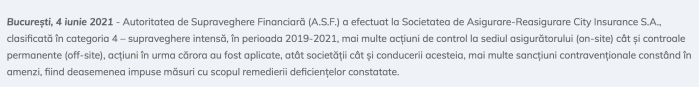 ASF transmite azi, 4 iunie 2021, un comunicat, scurs pe surse încă de cu o zi înainte, Parchetul trebuind să se sesizeze referitor la persoana (persoanele) din ASF (nu la jurnalisti, care și-au făcut treaba) care au avertizat societatea City Insurance, pe surse, privind trecerea sub administrarea FGA, cu o zi înainte.