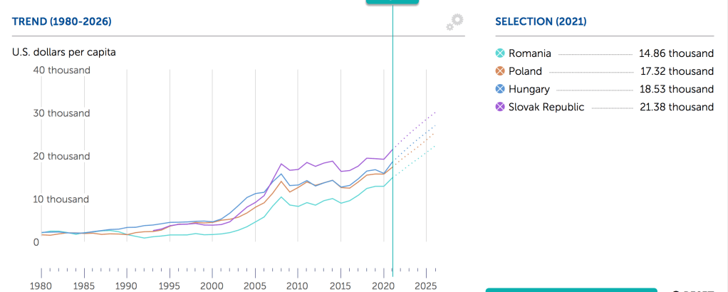 Si inca ceva: Nu va plac datele Bancii Mondiale? Ele coicind si cu ale FMI-ului. Ba mai mult, datele FMI care analizeaza trend-urile (inclusiv pana in 2026) arata ca NU EXISTA NICIO SANSA sa depasim Ungaria, Polonia, nu mai vorbesc despre Slovacia, care decoleaza: