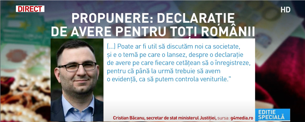 Am acceptat cu placere invitatia Laurei Chiriac, B1TV, pentru a analiza adevarata miza a ,,propunerii” de declaratie de avere pentru toata lumea. O găsiți, dezvoltata, aici.