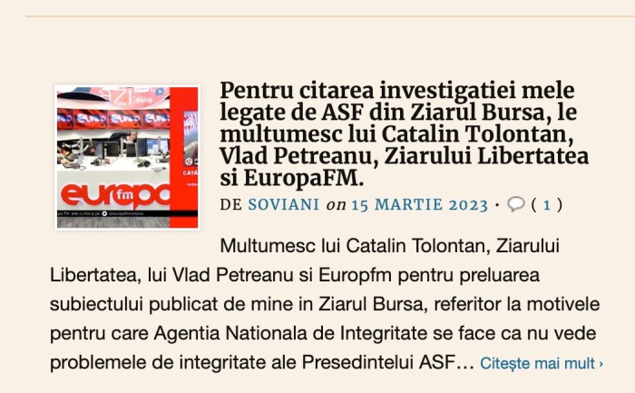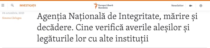 Multumesc Europa Libera pentru preluarea investigatiei mele din Ziarul Bursa, într-un material legat de cine și cum conduce Agenția Națională de Integritate și mai ales, cu ce rezultate.