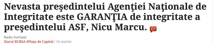 ,,Într-o investigație, jurnalistul Radu Soviani susține că numirea soției lui Florin Moise la ASF nu ar fi fost întâmplătoare. Președintele ASF, Nicu Marcu, ar avea probleme în declarația de avere, care ar fi fost trecute cu vederea de ANI. Mai exact, ar fi vorba de vânzarea unei case deținute de Nicu Marcu fiicei sale, cu un preț mult mai mic decât cel de achiziție și decât cel al pieței.”.